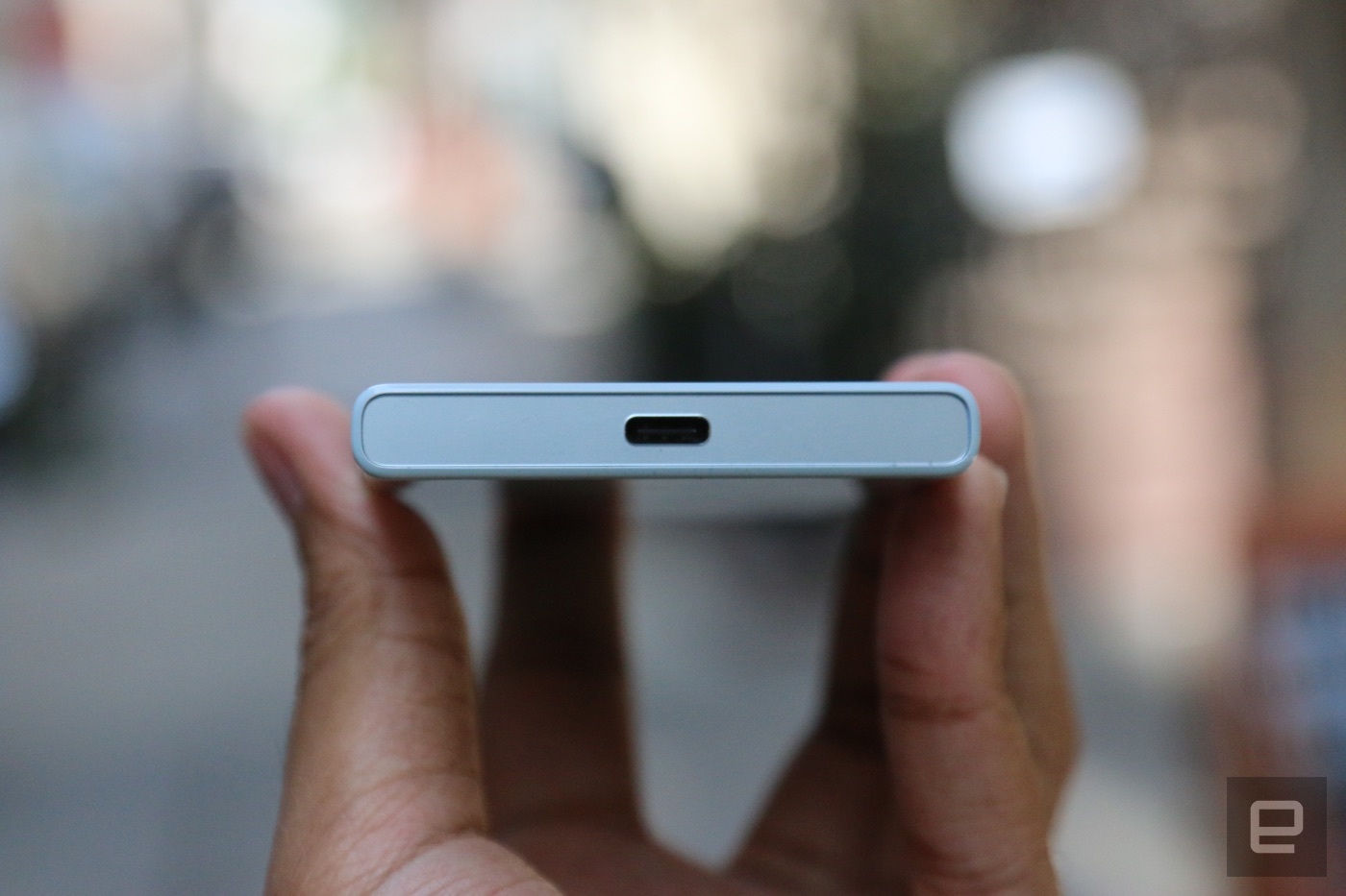 بهتر است نگاهی به پشت دستگاه داشته باشیم. در بالا سنسور 23 مگاپیکسلی با حسگر سه گانه سونی قابل مشاهده است که عینا در ساختار اکسپریا ایکس زد (Xperia XZ) نیز مورد استفاده قرار گرفته. در کنار فوکوس اتوماتیک که به شاخصه ثابت دستگاههای سری ایکس بدل شده، اکسپریا ایکس کامپکت همانند پرچمدار جدید سونی از ماژول فوکوس لیزری بهره میبرد و از حسگر RGB/IR نیز برای تعادل نور سفید نیز برخوردار است. ما از اینکه چشم بادامیها از سنسوری مشابه برای دوربین پرچمدار و نسخه میان رده پرچمدار سابق خود استفاده کردهاند تعجب کردیم. سونی با در پیش گرفتن این سیاست قصد دارد سری تلفنهای هوشمند میان رده خود را در سطحی بالاتر از رقبا قرار دهد و سهم بیشتری از بازار میان ردهها را نصیب خود کند.