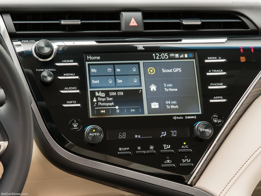 در داخل خودرو نیز شرکت تویوتا، سیستم اطلاعات و سرگرمی Entune 3.0 را برای نسل جدید سدان محبوب خود ارائه داده و نسخه V6 به سیستم ناوبری متصل نیز مجهز شده است. این سیستم اطلاعاتی و سرگرمی جدید از ویژگیهایی مانند استارت خودرو از راه دور، پیدا کردن خودرو، اطلاعرسانی از وضعیت خودرو و اینترنت وای فای برخوردار است.