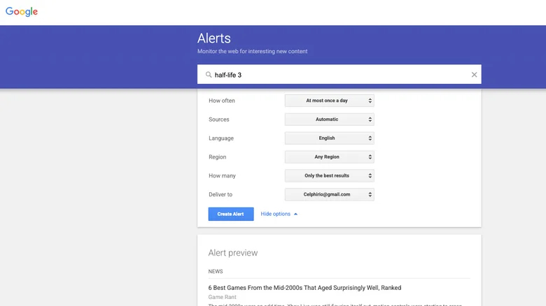 به جای اینکه هر روز یک موضوع را جستجو کنید، به آدرس google.com/alerts بروید و هشدار دلخواهتان را تعریف کنید. میتوانید نوع منابع، منطقه، زبان و زمانبندی هشدارها را شخصیسازی کنید.