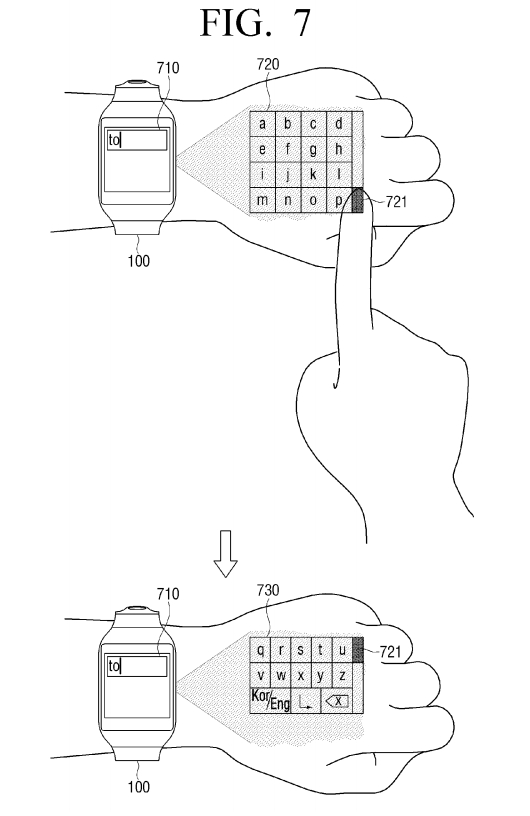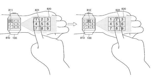 بدین ترتیب علاوه بر دست و مچ کاربر، حتی اگر ساعت بر روی میز قرار گیرد، رابط کاربری آن بهخوبی بر روی سطح صاف نمایش داده میشود. در پتنت سامسونگ، کاربران میتوانند رابط ساعت را بر پشت دست، روی پنجه و مچ نمایش دهند و یا حتی دکمههای مجازی را بر روی هر یک از انگشتان خود تعریف کنند. در تصاویر منتشر شده به همراه این خبر، نحوه استفاده از صفحهکلید، بخش تماس و شمارهگیری، گشت و گذار در اپلیکیشنها و حتی موقعیتیابی GPS در چنین محصولی ترسیم شدهاند. تمامی این فعالیتها بر روی دست کاربران قابل اجرا هستند.
