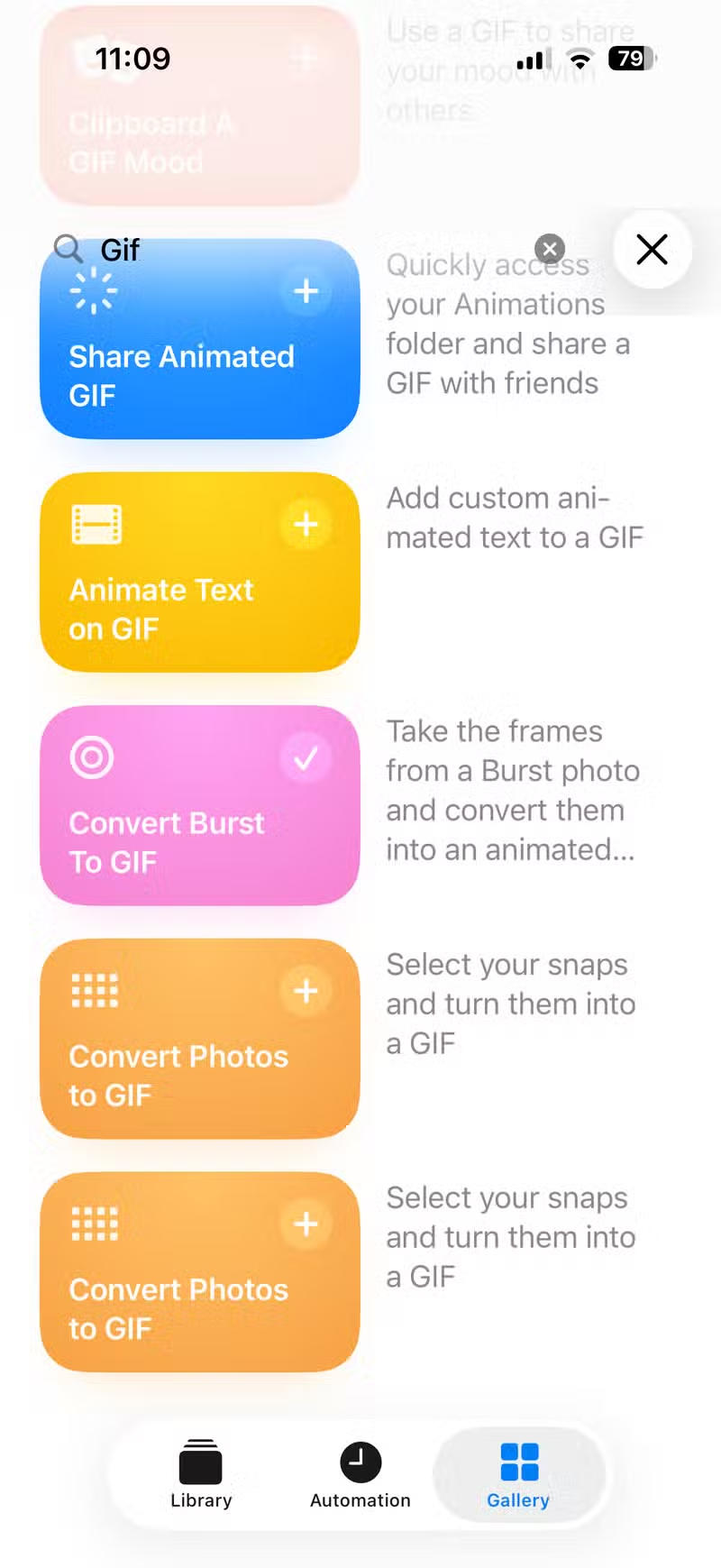 پس از گرفتن عکسها برنامه Shortcuts را باز کنید و Convert Burst to GIF را جستجو کنید. میانبر را اضافه کرده و عکسهای خود را انتخاب کنید تا GIF شما در چند ثانیه آماده شود.