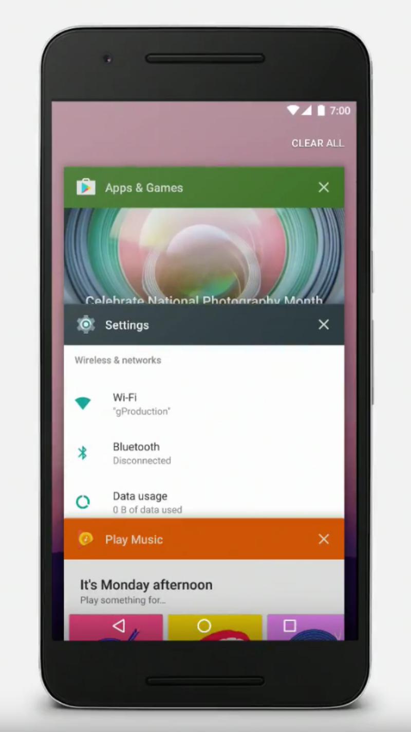 البته در آینده گزینهای به نام چند پنجرهای وجود خواهد داشت و پیشرفتهایی نیز در سوئیچ بین تسکها اعمال خواهد شد. علاوه بر آن شما شاهد یک دکمه به نام “Clear All” خواهیم بود که شما میتوانید از بههمریختگی بیش از حد اپلیکیشنهای در حال اجرا پایان بخشید. هرچند که سیستم عامل Android N اپلیکیشنهایی که شما استفاده کمی از آنها دارید را بهصورت خودکار حذف خواهد کرد. ویژگی دیگری نیز به نام “Quick Switch” (سوئیچ سریع) اضافه خواهد شد که با دو بار ضربه زدن به دکمه آخرین اپلیکیشنها شما را قادر میسازد تا بلافاصله به آخرین برنامههایی که شما از آنها استفاده کردید سوئیچ کنید. این ویژگی جدید دقیقاً عملکردی شبیه به کلید ترکیب Alt+Tab در یک کامپیوتر خواهد داشت.