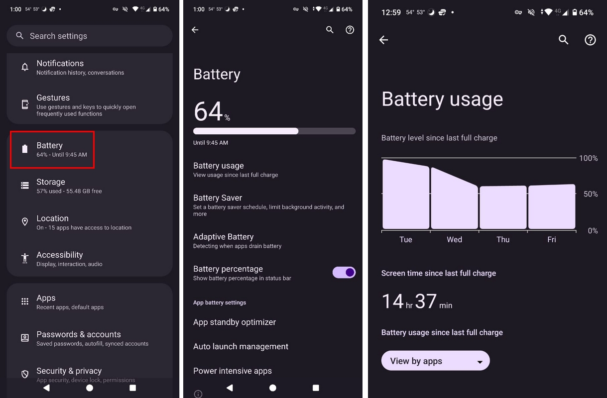 - کاهش روشنایی صفحه: نمایشگر بزرگترین مصرفکننده باتری در گوشیهای هوشمند است. روشنایی صفحه را به صورت دستی کاهش دهید یا از گزینه روشنایی تطبیقی (Adaptive brightness) استفاده کنید.