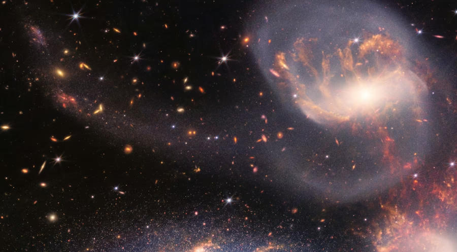 اخترشناسان با استفاده از دادههای تلسکوپ فضایی جیمز وب و هابل، یک منظومه فوقالعاده کمیاب را کشف کردهاند که در آن حداقل پنج کهکشان در حال ادغام با یکدیگر هستند.
