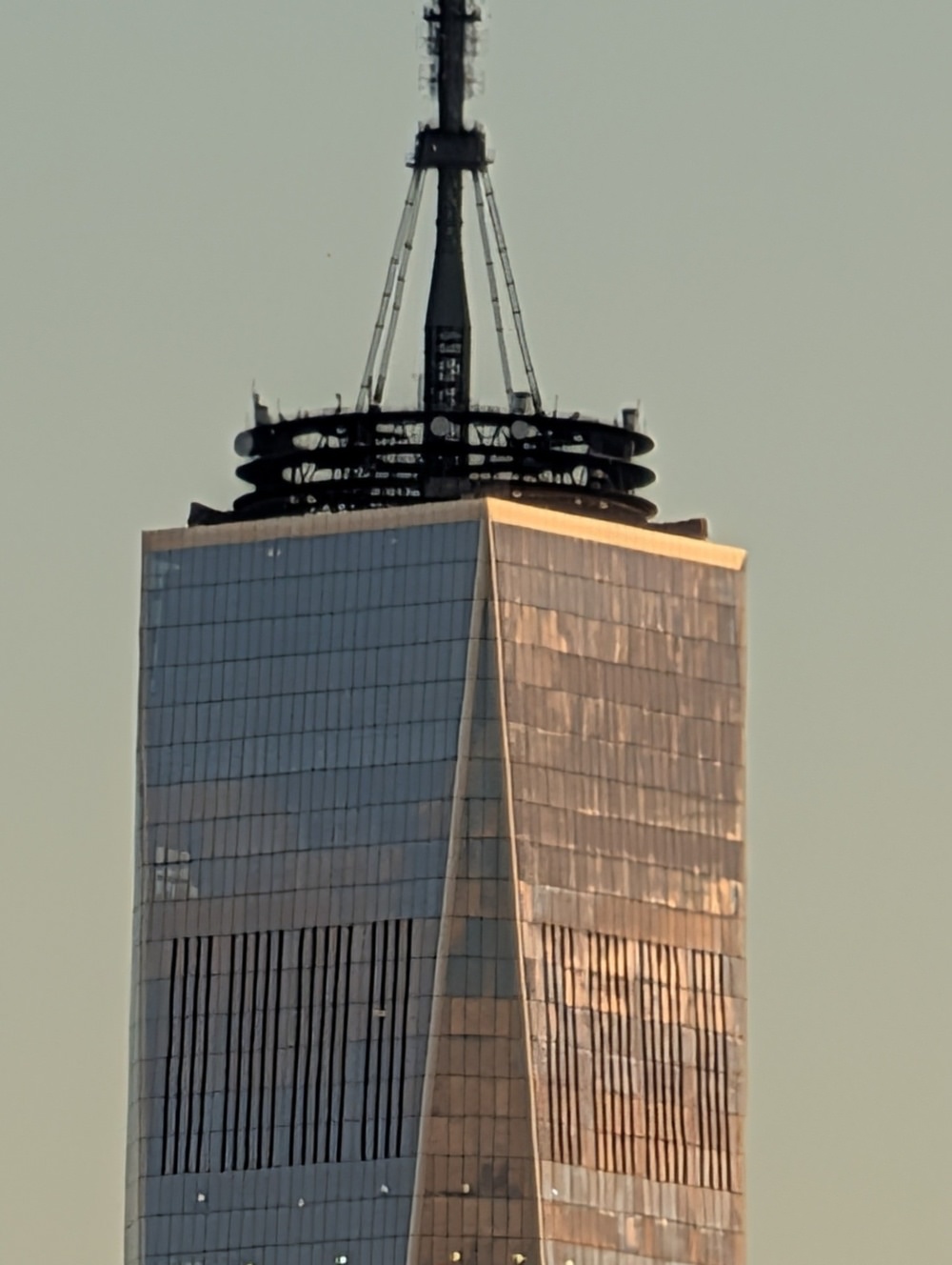 این قابلیت عملکردی سینوسی دارد؛ گاهی نتایج شگفتانگیزی ارائه میدهد و گاهی کاملا ناموفق است. همچنین، ثابت نگه داشتن گوشی برای عکاسی با زوم ۱۰۰ برابر به دلیل لرزش شدید سنسور، تقریباً غیرممکن است. در تصاویر زیر میتوانید نمونه عملکرد این زوم را روی مرکز تجارت جهانی مشاهده کنید.