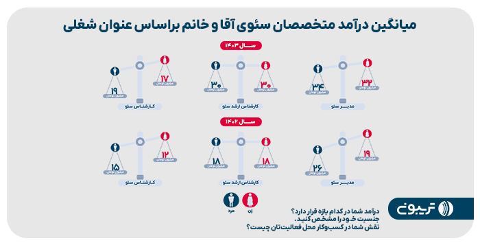 میانگین درآمد ماهانه متخصصان سئو در سال ۱۴۰۳ برابر ۲۹ میلیون تومان بوده است. نزدیک به ۲۰ درصد متخصصان سئو در سال ۱۴۰۳ بالای ۵۰ میلیون تومان در ماه درآمد داشتهاند. در سال گذشته، میانگین درآمد ماهانه مدیران سئوی آقا و خانم بهترتیب ۳۴ و ۳۲ میلیون تومان، میانگین درآمد ماهانه کارشناسان ارشد سئوی آقا و خانم بهشکل یکسان ۳۰ میلیون تومان و میانگین درآمد ماهانه کارشناسان سئوی آقا و خانم ۱۹ و ۱۷ میلیون تومان بوده است. همچنین، میانگین درآمد متخصصان سئوی یکشغله، دوشغله و سهشغله در سال ۱۴۰۳ بهترتیب ۲۷، ۲۹ و ۳۶ میلیون تومان بوده است.