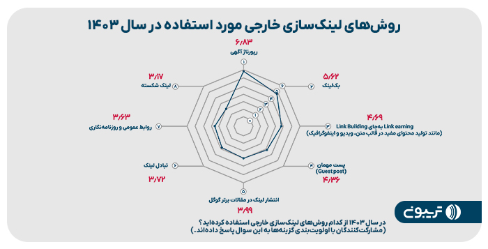 آنان موثرترین روشهای لینکسازی خارجی در سال ۱۴۰۳ را بهترتیب «انتشار رپورتاژ آگاهی بدون تگ تبلیغاتی»، «انتشار رپورتاژ آگهی با تگ تبلیغاتی»، «لینکسازی لایهای»، «Link earning بهجای Link Building (مانند تولید محتوای مفید در قالب متن، ویدیو و اینفوگرافیک)»، «بهروزرسانی رپورتاژها» و «بک لینک سایت واید» دانستهاند.