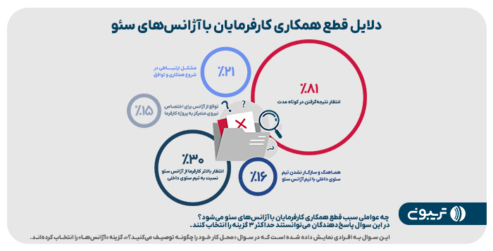 ۵۱ درصد از متخصصان سئوی شاغل در آژانسها و فریلنسرها و مشاوران سئو اعلام کردهاند که در سال ۱۴۰۳ بودجه کارفرمایان با افزایش همراه بوده است. در سال ۱۴۰۳ بزرگترین دلیل قطع همکاری کارفرمایان با آژانسهای سئو «انتظار نتیجه گرفتن در کوتاه مدت» و بزرگترین انتظار کارفرمایان از متخصصان سئو «افزایش فروش» بوده است.