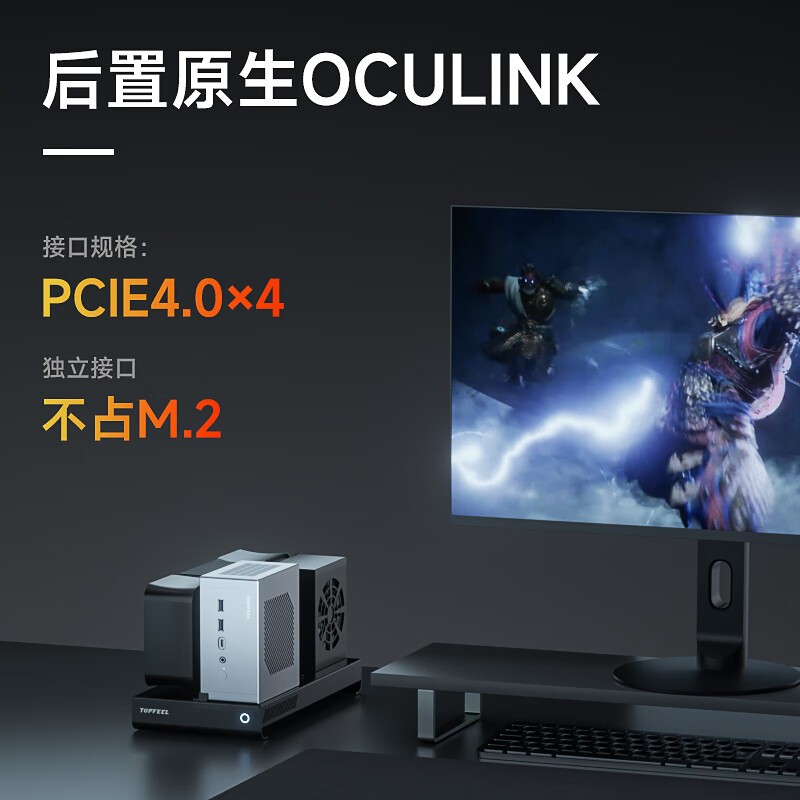 یکی از مهمترین ویژگیهای Topfeel DeskOne T2، پشتیبانی از حداکثر ۱۲۸ گیگابایت رم DDR5-5600 و سه اسلات حافظه M.2 PCIe 4.0 است. این دستگاه از درگاههای متنوعی نیز بهره میبرد؛ پنل جلویی شامل دو پورت USB-A با سرعت ۱۰ گیگابیت بر ثانیه، یک پورت USB4 Type-C و جک ۳.۵ میلیمتری صدا است. در پنل پشتی نیز یک پورت HDMI 2.1، یک DisplayPort 2.1، یک پورت USB4 Type-C دیگر، درگاه OCuLink 4i برای اتصال کارت گرافیک خارجی، دو پورت USB-A، یک جک صدای دیگر و دو پورت شبکه ۲.۵ گیگابیتی تعبیه شده است.