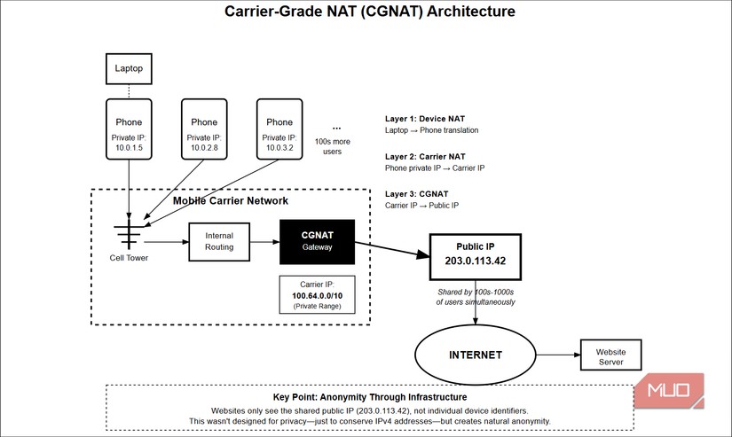 شبکههای تلفن همراه ترافیک را از چندین لایه عبور میدهند. ابتدا لپتاپ شما با گوشی ارتباط برقرار میکند، سپس گوشی این اتصال را از طریق شبکه داخلی خود ترجمه میکند و در نهایت سیستم CGNAT اپراتور آن را قبل از رسیدن به اینترنت دوباره ترجمه میکند. هر لایه، درجه جداسازی شما از وبسایتهایی که بازدید میکنید را افزایش میدهد.