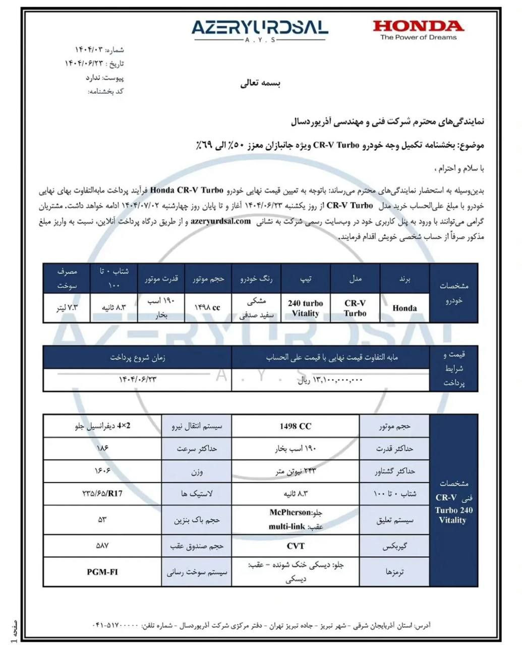 پیش از اعلام واریز وجه جدید از سوی شرکت آذریوردسال، مبلغ 2 میلیارد و 200 میلیون تومان از ثبت نام کنندگان دریافت شده بود و حالا در دور جدید بایستی 1 میلیارد و 310 میلیون پرداخت گردد. قیمت نهایی هوندا CR-V توربو 3 میلیارد و 510 میلیون تومان اعلام شده و در رنگبندی سفید صدفی و مشکی عرضه خواهد شد.