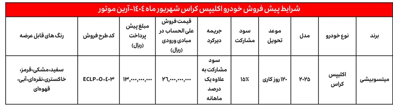 این طرح پیش فروش میتسوبیشی اکلیپس کراس با سود مشارکت سالانه ۱۵ درصد همراه است. جریمه تاخیر در تحویل نیز معادل سود مشارکت به علاوه یک درصد ماهیانه در نظر گرفته شده است. ثبت نام از روز یکشنبه ۳۰ شهریور آغاز میشود.