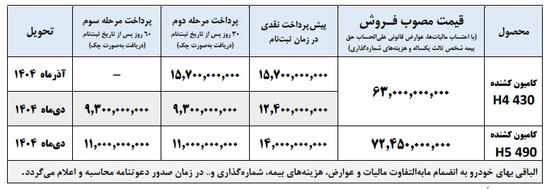 در این طرح، کشنده H5 490 با قیمت مصوب ۷ میلیارد و ۲۴۵ میلیون تومان و پیش پرداخت ۱ میلیارد و ۴۰۰ میلیون تومان فراهم شده است. پرداخت مرحله دوم و مرحله سوم به ترتیب در بازه زمانی ۳۰ روز و ۶۰ روز پس از تاریخ ثبت نام اعلام شده و مبلغ واریزی برای هر مرحله ۱ میلیارد و ۱۰۰ میلیون تومان خواهد بود. الباقی بهای باقیمانده این محصولات به همراه مالیات، عوارض و سایر هزینهها در زمان صدور دعوتنامه محاسبه و اعلام میشود. ضمنا موعد تحویل تمامی محصولات ذکر شده در جدول فوق قابل مشاهده است.