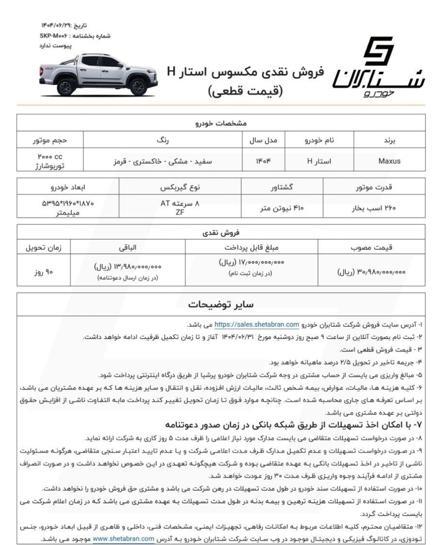 قیمت پیکاپ مکسوس استار اچ در این طرح فروش نقد و اقساط، 3 میلیارد و 98 میلیون تومان اعلام شده است. متقاضیان باید در زمان ثبت نام مبلغ 1 میلیارد و 700 میلیون تومان به عنوان پیش پرداخت به حساب شتابران خودرو واریز کرده و 1 میلیارد و 398 میلیون تومان دیگر را در زمان ارسال دعوتنامه بپردازند. در بخشنامه فروش، موعد تحویل حداکثر 90 روز کاری اعلام شده و رنگبندی آن شامل سفید، مشکی، خاکستری و قرمز است. نکات زیر را پیش از ثبت نام مدنظر داشته باشید.