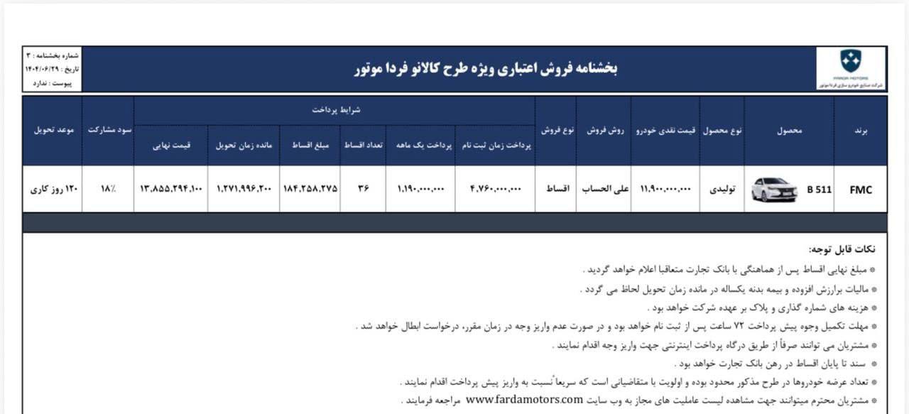 در این طرح که پس از حواشی به وجود آمده بابت تأخیر در تحویل خودروها اعلام شده، قرار است سدان فردا 511 با قیمت قطعی 1 میلیارد و 190 میلیون تومان به فروش برسد. در حال حاضر متقاضیان باید 476 میلیون تومان به حساب شرکت واریز کرده و طی یک ماه آینده، 119 میلیون تومان دیگر پرداخت کنند. تعداد اقساط 36 ماهه بوده و مبلغ هر قسط 18 میلیون و 425 هزار تومان است. به این طرح سود مشارکت 18 درصد تعلق میگیرد و خودروها حداکثر 120 روز کاری تحویل داده میشوند.