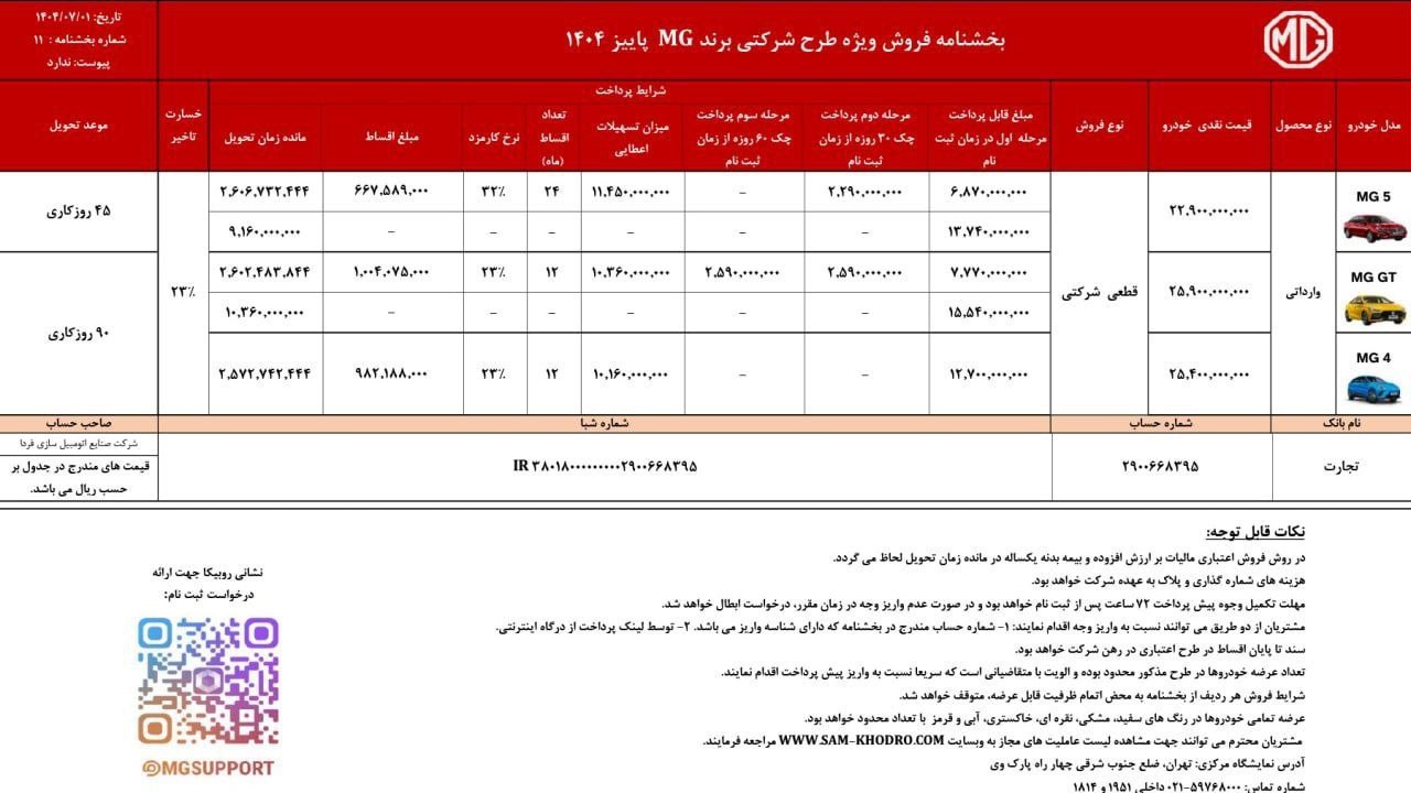 آخرین خودرو فردا موتورز در طرح فروش پاییزی 1404، ام جی 4 با قیمت قطعی 2 میلیارد و 540 میلیون تومان است. این خودرو با تسهیلات 1 میلیارد و 16 میلیون تومانی و دوره بازپرداخت 12 ماهه قابل سفارش است.