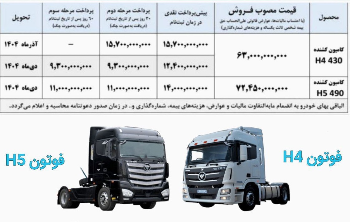 شرکت ایران خودرو دیزل با انتشار یک بخشنامه جدید، شرایط فروش نقدی و مرحلهای دو کشنده فوتون H4 و H5 را با قیمت قطعی برای مهر ماه 1404 اعلام کرد. کلیه علاقهمندان به خرید این دو محصول سنگین میتوانند از فردا سه شنبه یکم مهر سال جاری، نسبت به ثبت نام و واریز وجه اولیه اقدام کنند.