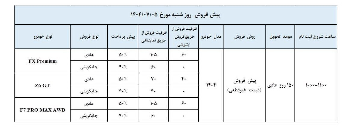 طبق اطلاعیه مدیران خودرو، این مرحله از پیش فروش سه محصول پرطرفدار از برند فونیکس را در بر میگیرد که هر یک سهم قابل توجهی در بازار خودروهای کراس اوور و سدان لوکس ایفا میکنند. این محصولات شامل کراس اوور فونیکس FX پریمیوم، سدان فونیکس Z6 GT (آریزو 6 جی تی) و فونیکس F7 پرومکس AWD است.