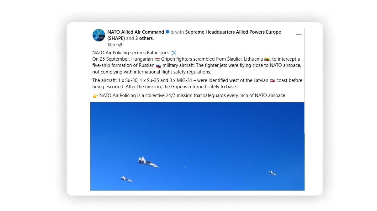 جنگندههای مجارستان روز ۲۵ سپتامبر برای رهگیری جنگندههای روسیه که به حریم هوایی ناتو نزدیک میشدند، به پرواز درآمدند. این اقدام واکنشی سریع به عدم رعایت پروتکلهای ایمنی پرواز بود.