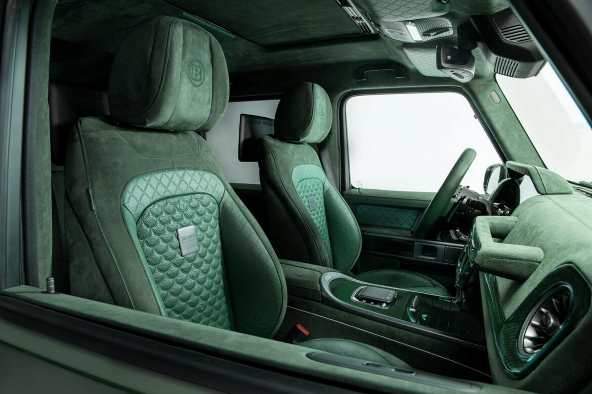 اما هنر برابوس تنها به بیرون خودرو محدود نمیشود؛ فضای داخلی نیز با همان وسواس و دقت خیرهکننده، کاملاً شخصیسازی شده است. همانطور که پیشتر اشاره شد، رنگ سبز خیرهکنندهای که بدنه خودرو را پوشانده، به داخل کابین نیز راه پیدا کرده است. برابوس فضای داخلی را با ترکیبی استادانه از دو طیف رنگ سبز و با استفاده از چرم و جیر اعلا و سفارشی تزئین کرده است. صندلیهای بازطراحی شده با ارگونومی بهبود یافته، کنسول مرکزی، ستونها، پوشش سقف و رودریها همگی با روکشی جدید از چرم و جیر سبز رنگ پوشانده شدهاند که حس لوکس بودن را به سرنشینان منتقل میکند.