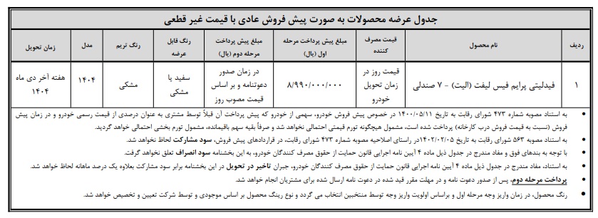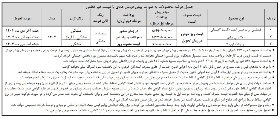 شرکت بهمن موتور شرایط فروش محصولاتش را برای منتخبین واجد شرایط اعلام کرد. بر این اساس، این افراد میتوانند برای تکمیل فرایند ثبت نام بهمن موتور و تکمیل وجه در طرح پیش فروش بهمن موتور با قیمت غیرقطعی اقدام کنند. مهلت تعیین شده برای واریز وجه آنلاین از ساعت ۱۰ صبح روز چهارشنبه ۹ مهر آغاز شده و تا پایان روز سهشنبه ۱۵ مهر ۱۴۰۴ ادامه خواهد داشت. این فرصت صرفا برای منتخبین اصلی طرح است که صلاحیت آنها توسط سازمانهای مربوطه تایید شده است.