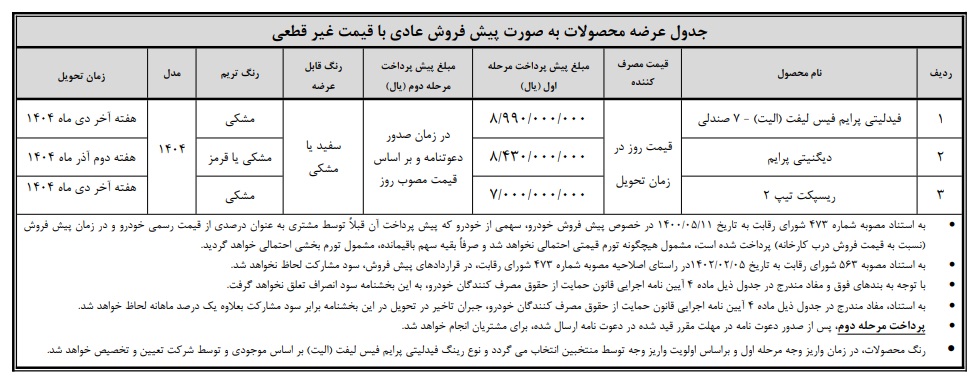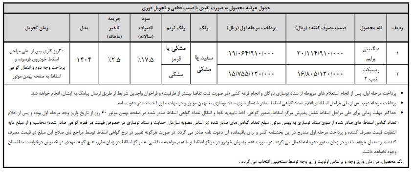 - آغاز طرح فروش بهمن موتور در مهر ۱۴۰۴: عرضه ریسپکت ۲ و دیگنیتی پرایم با شرایط نقدی، اعتباری و پیشفروش