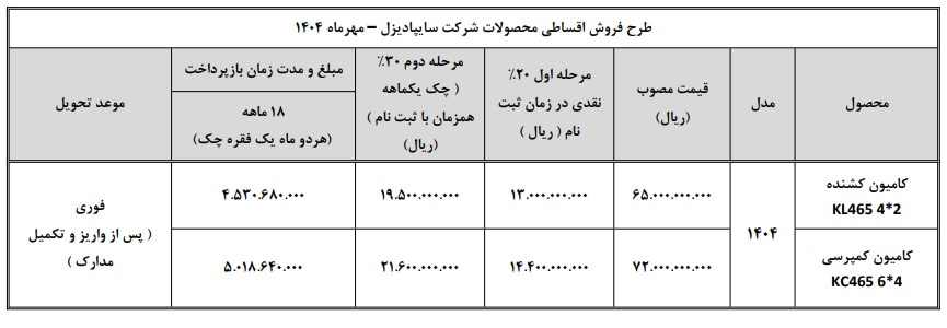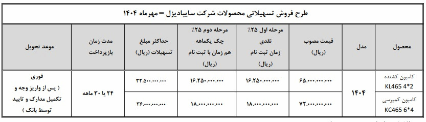 در کنار این، سایپا دیزل برای تسهیل دسترسی متقاضیان با محدودیتهای سرمایهای، طرحهای فروش تسهیلاتی و اقساطی را نیز فعال کرده است. در این طرح کشنده KL465 (4×2) و کامیون کمپرسی KC465، مجدداً با قیمت قطعی ارائه میشوند، اما موعد تحویل این خودروها در این طرح تابع تکمیل شدن فرآیند ثبتنام و واریز وجوه اولیه تسهیلات خواهد بود جزئیات فروش اقساطی در جدول فوق قابل مشاهده است. همچنین کلیه مراحل ثبتنام برای این طرحهای فروش، صرفاً و منحصراً بهصورت اینترنتی از طریق سامانه رسمی فروش شرکت سایپادیزل به نشانی esales.saipadiesel.ir امکانپذیر است.