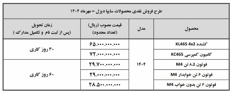 شرکت سایپا دیزل با انتشار یک بخشنامه جدید، شرایط فروش نقدی و اقساطی محصولات مونتاژی خود را در مهر 1404 اعلام کرد.