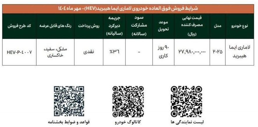 جدول شرایط فروش قطعی لاماری ایما هیبریدی – مهر 1404