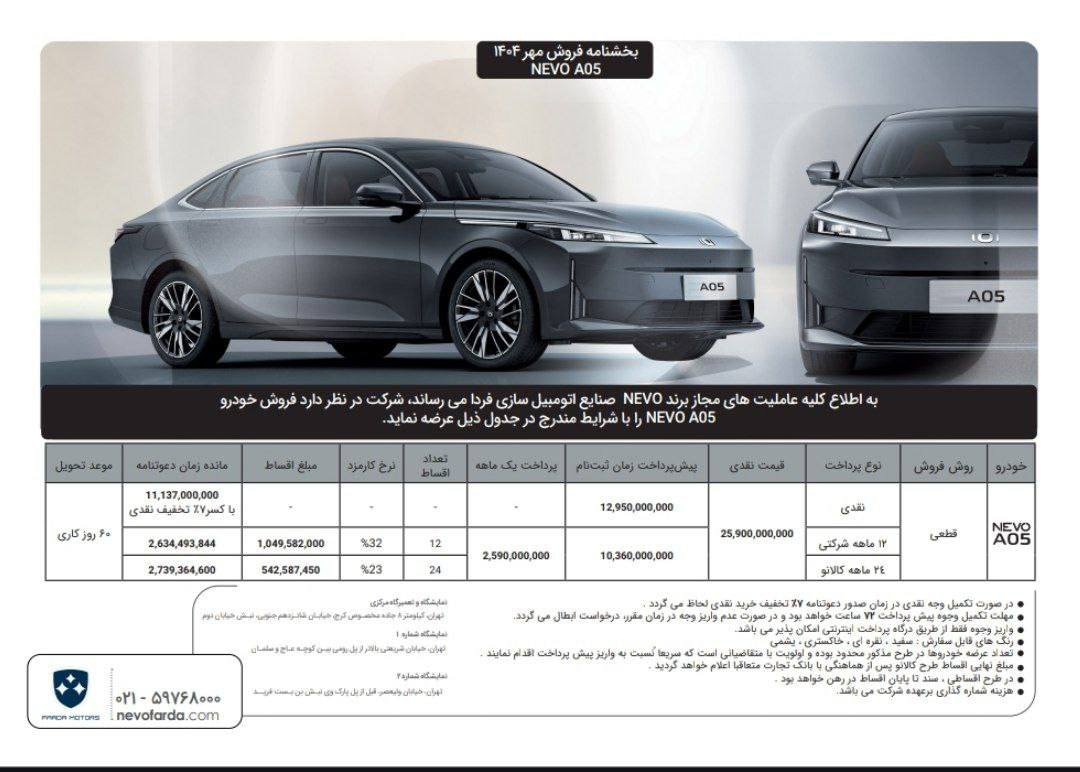 شرکت فردا موتورز با انتشار یک اطلاعیه، شرایط فروش قطعی سدان نوو A05 را همراه با افزایش قابل توجه قیمت برای مهر 1404 اعلام کرد.