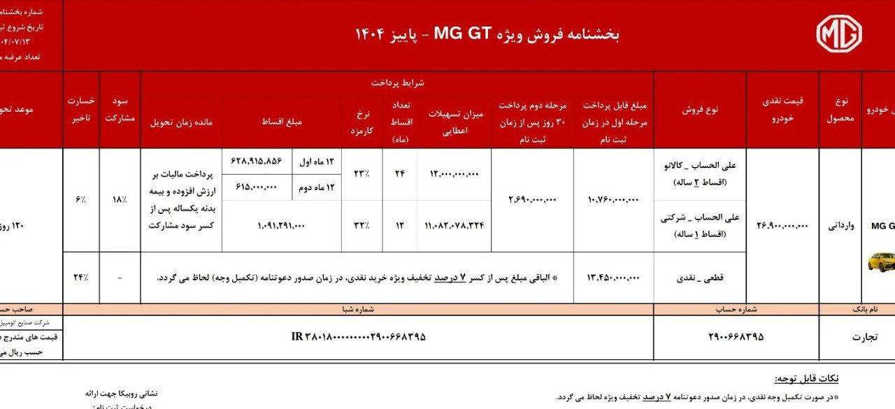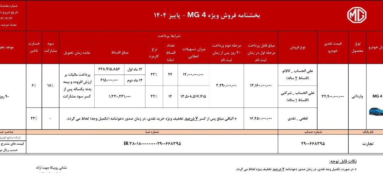 شرکت فردا موتورز در اطلاعیهای جدید، شرایط فروش نقدی و اقساطی خودروهای ام جی جی تی، ام جی ۵ و ام جی ۴ را در مهر ۱۴۰۴ منتشر کرد.
