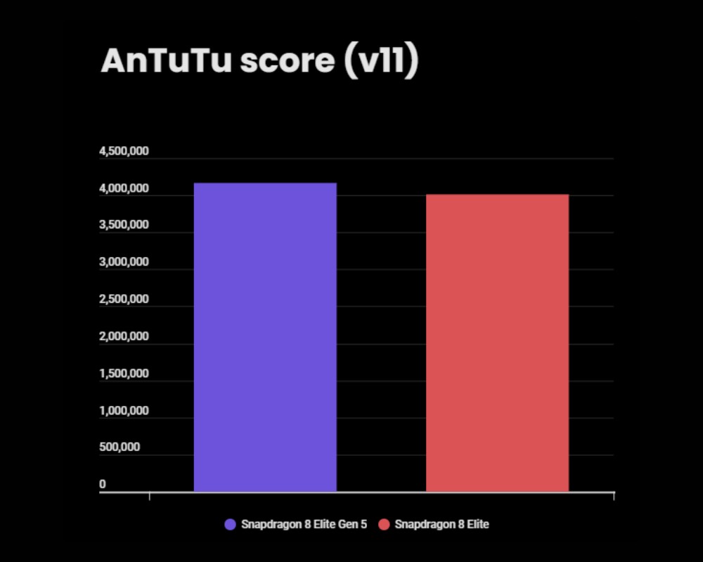هر دو تراشه اسنپدراگون 8 الیت نسل 5 و دایمنسیتی 9500 موفق به عبور از مرز ۴ میلیون امتیاز در آنتوتو شدهاند. اسنپدراگون با امتیاز کل ۴,۱۶۶,۳۳۹ در صدر قرار گرفت که حدود ۴٪ بیشتر از دایمنسیتی با امتیاز ۴,۰۱۱,۹۳۲ است. در بخش CPU، اسنپدراگون ۱۶٪ عملکرد بالاتری دارد (۱,۲۱۳,۸۴۵ در مقابل ۱,۰۴۳,۲۴۷)، اما در بخش GPU، دایمنسیتی ۹۵۰۰ با اختلاف اندک ۳٪ پیشتاز است (۱,۵۱۰,۹۸۲ در مقابل ۱,۴۶۸,۳۵۱).