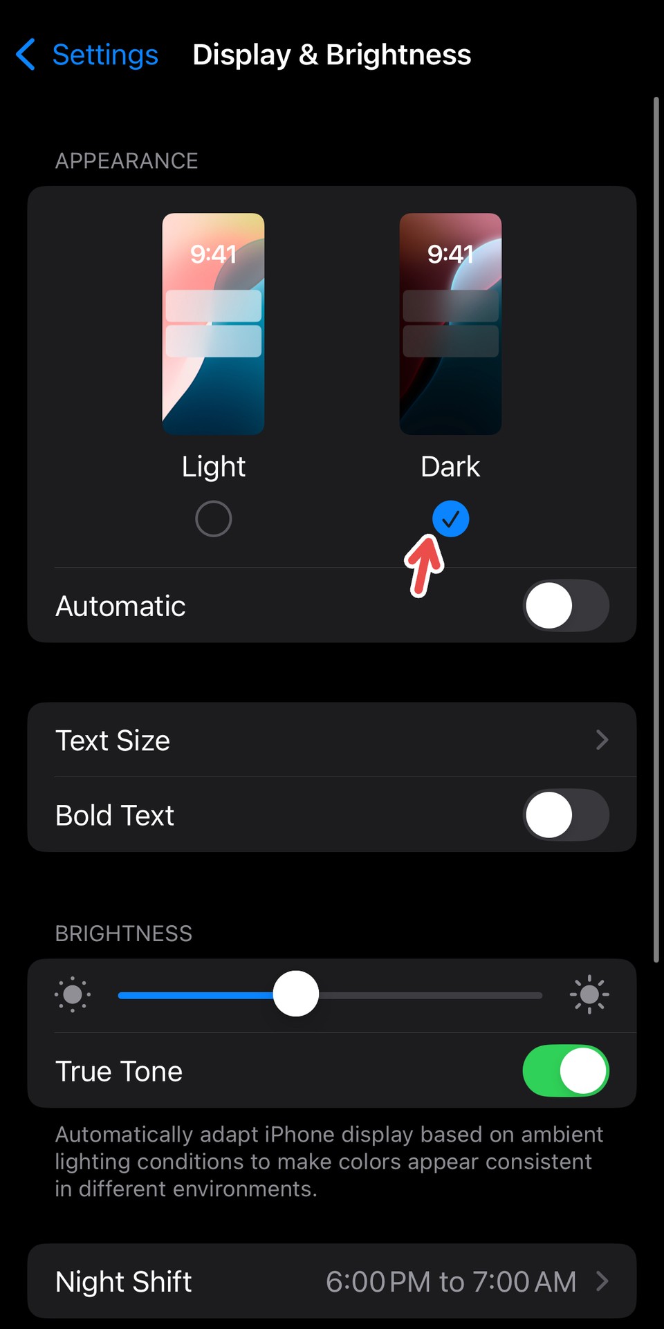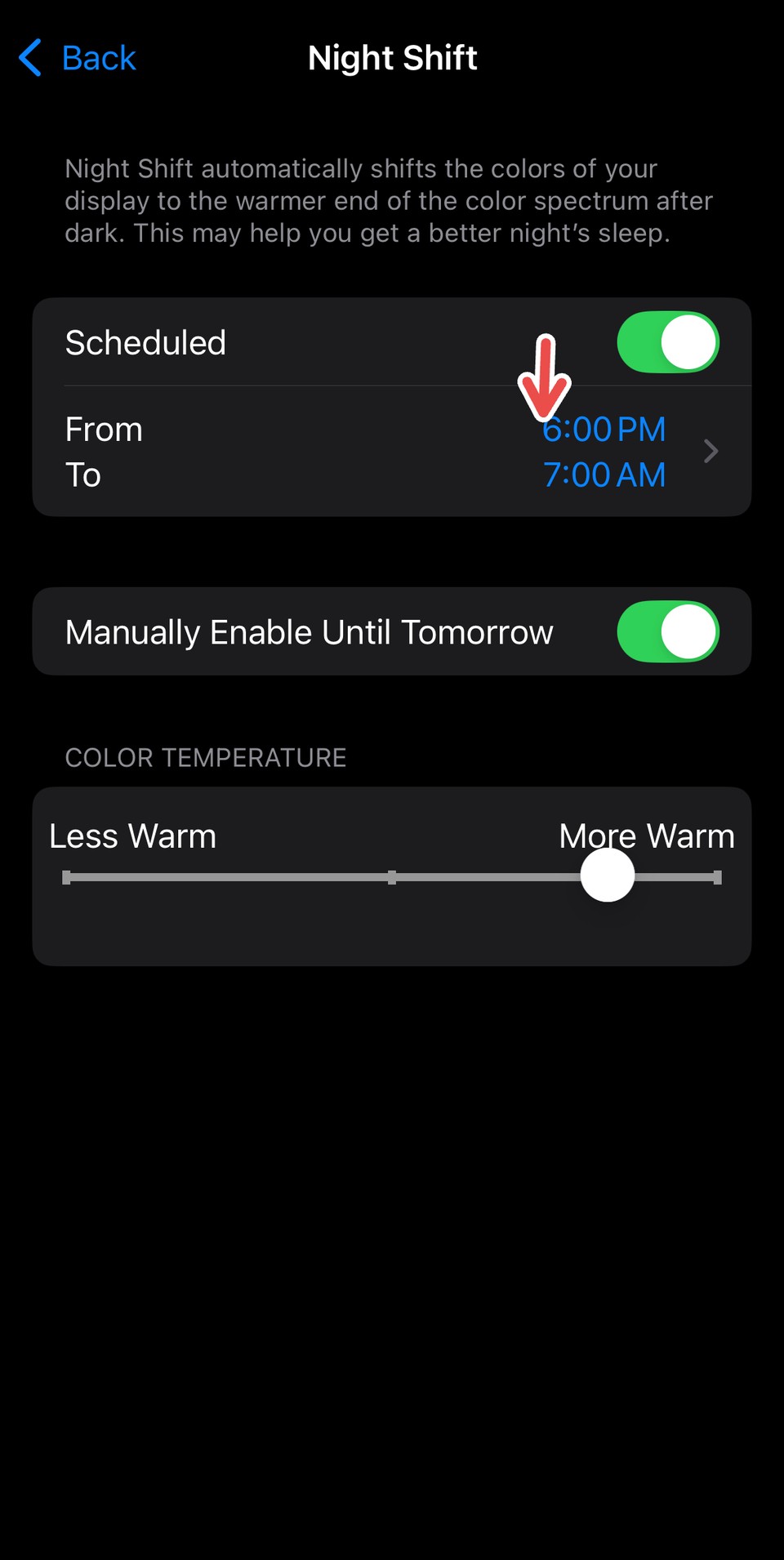 Night Shift نمایشگر گوشی را به سمت طیف گرمتری از رنگها سوق میدهد که دیدن صفحه را در تاریکی آسانتر میکند. برای فعالسازی به Settings > Display and Brightness > Night Shift بروید و زمان شروع و پایان را تنظیم کنید.