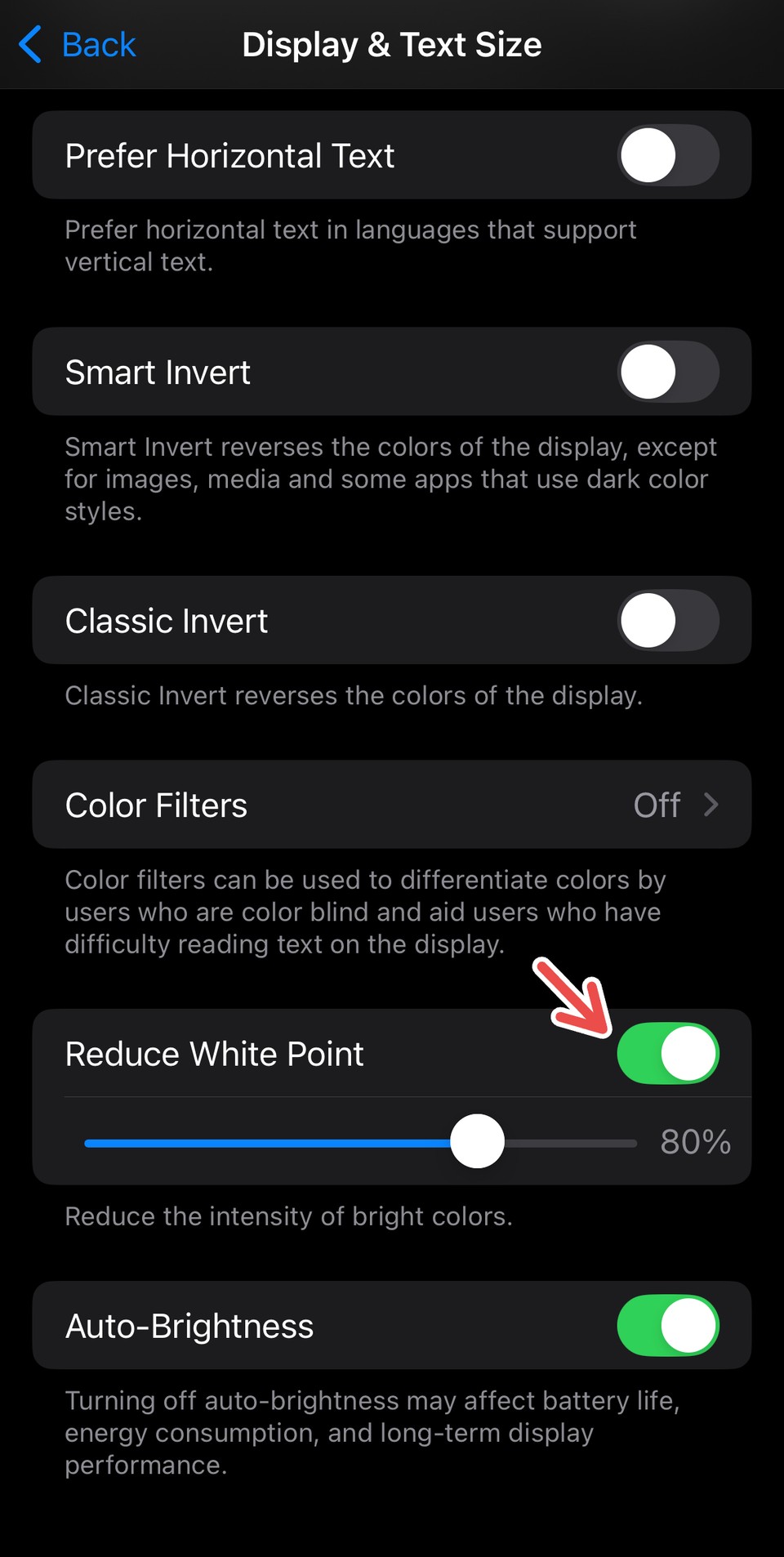 “Reduce White Point” شدت رنگهای روشن روی صفحه را کاهش میدهد تا خستگی چشم قبل از خواب را از بین ببرد. برای فعال کردن، به Settings > Accessibility > Display and Text Size > Reduce White Point بروید. برای دسترسی سریع، Accessibility Shortcut را تنظیم کنید (Settings > Accessibility > Accessibility Shortcut) و با سه بار فشار دادن دکمه کناری آن را فعال کنید.