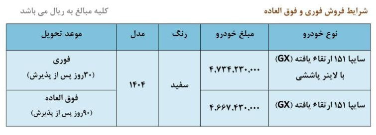 گروه خودروسازی سایپا با انتشار یک بخشنامه جدید، شرایط فروش فوری وانت سایپا 151 جدید تیپ GX را در مهر 1404 اعلام کرد.