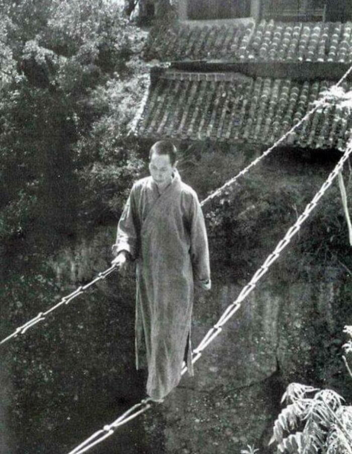 این عکس یک راهب را نشان میدهد که با دقت از روی یک پل زنجیری در یون یان سی چین، که با نام معبد ابر صخره نیز شناخته میشود، عبور میکند. این عکس در سال 1930 گرفته شده است. این پل از دو زنجیر نامطمئن تشکیل شده که یک زنجیر آن بهعنوان مسیر باریک پیادهروی و دیگری بهعنوان نرده استفاده میشود. این یکی از دو مسیر دلهرهآور به کتابخانه سوترا بود که روی صخره قرار داشت.