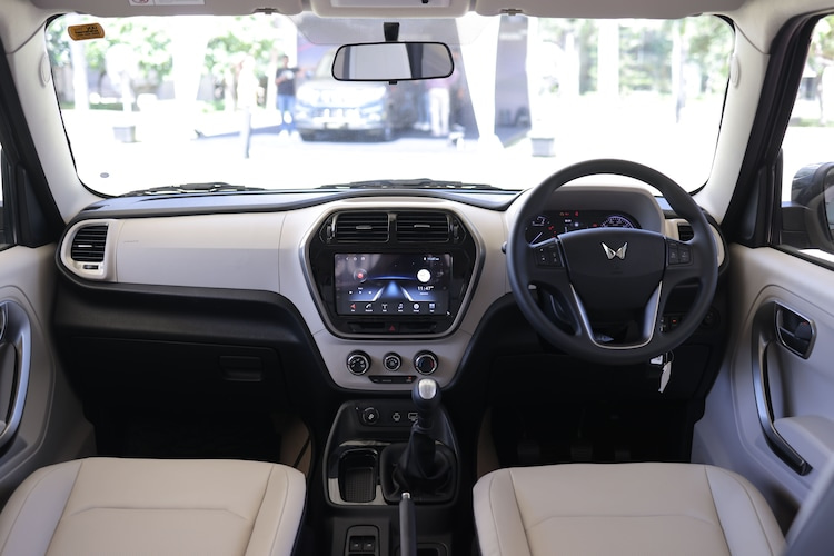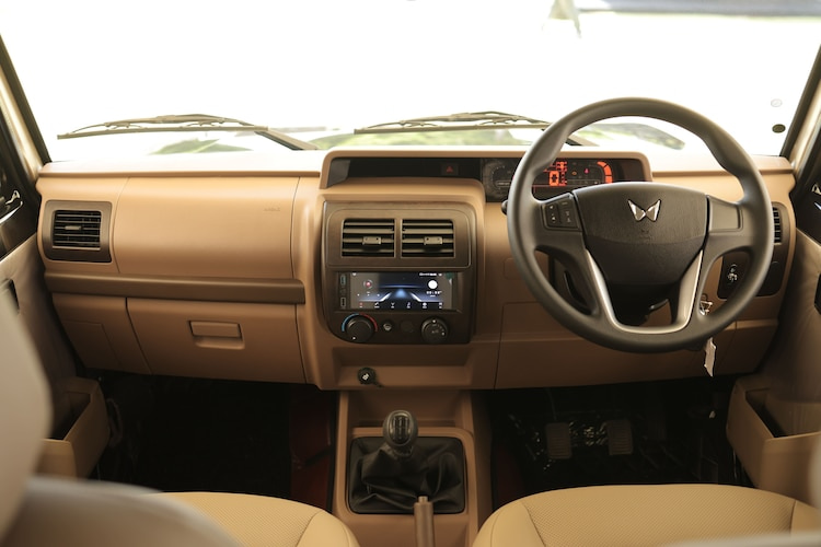 طراحی کابین و فضای داخلی ماهیندرا بولرو 2025 همچنان یادآور اصالت خودروهای شاسی بلند جانسخت و کاربردی است. مهمترین تغییر صورتگرفته در بخش میانی داشبورد، نصب یک نمایشگر لمسی ۷ اینچی است که بهعنوان هسته اصلی سیستم مولتیمدیا عمل میکند. این نمایشگر عملکردی ساده و متمرکز دارد و با وجود پشتیبانی از اتصال بلوتوث برای برقراری تماس و پخش موسیقی، فاقد قابلیتهای پیشرفته اتصال گوشی هوشمند مانند اپل کارپلی و اندروید اتو است. همچنین کلاستر راننده از حالت آنالوگ خارج شده و بهصورت دیجیتال و با طراحی بهروزتری جایگزین شده است.