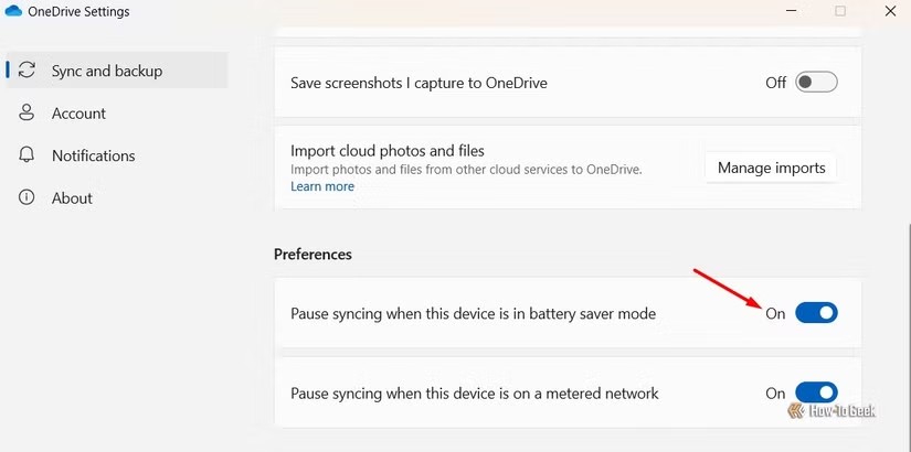 - اطمینان حاصل کنید که سوییچ کنار Pause syncing when this device is in battery saver mode فعال (On) باشد.