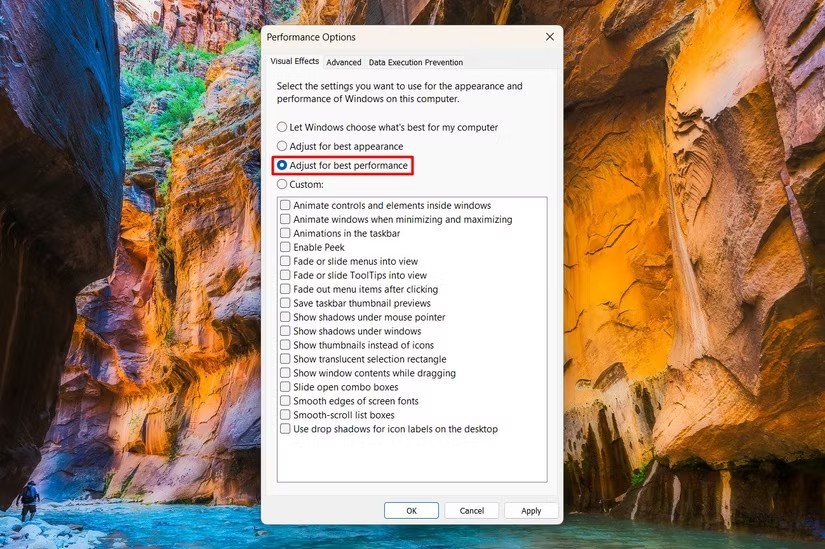 - در پنجره Performance Options، گزینه Adjust for Best Performance را انتخاب کنید.