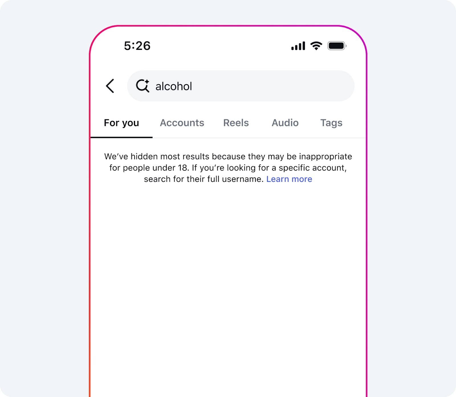 اینستاگرام جستجوی «کلمات کلیدی حساس و نامناسب» را نیز برای نوجوانان محدود میکند. این کلمات شامل مواردی مانند الکل، خشونت گرافیکی و املای عمدی اشتباه آنهاست که معمولاً برای دور زدن فیلترها استفاده میشوند. حتی اگر حساب کاربری که یک نوجوان قبلاً دنبال کرده، محتوای مغایر با این قوانین را به اشتراک بگذارد، اینستاگرام مانع از نمایش آن به نوجوان خواهد شد، حتی اگر این محتوا از طریق پیامهای دایرکت ارسال شده باشد.