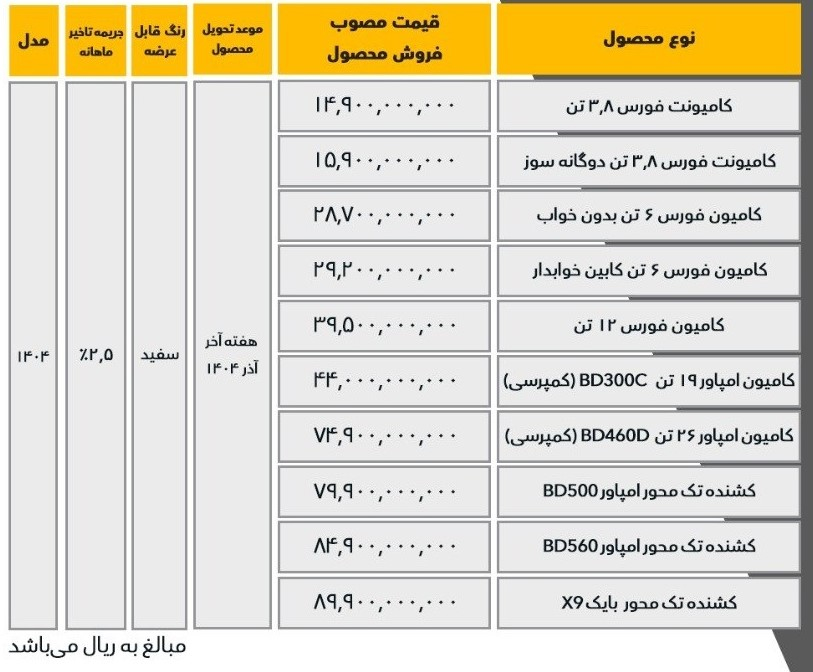 در بخش کامیونهای سنگین و کمپرسی، مدل امپاور ۱۹ تن BD300C با قیمت 4 میلیارد و 400 میلیون تومان و مدل امپاور ۲۶ تن BD460D با نرخ 7 میلیارد و 490 میلیون تومان عرضه میشود. در رده کشندهها، نسخه امپاور BD500 تکمحور با قیمت 7 میلیارد و 990 میلیون تومان و مدل قدرتمندتر BD560 تکمحور با نرخ 8 میلیارد و 490 میلیون تومان در دسترس قرار دارد. در بالاترین سطح قیمتی این فهرست، کشنده بایک X9 تکمحور با قیمت 8 میلیارد و 990 میلیون تومان قرار گرفته است.