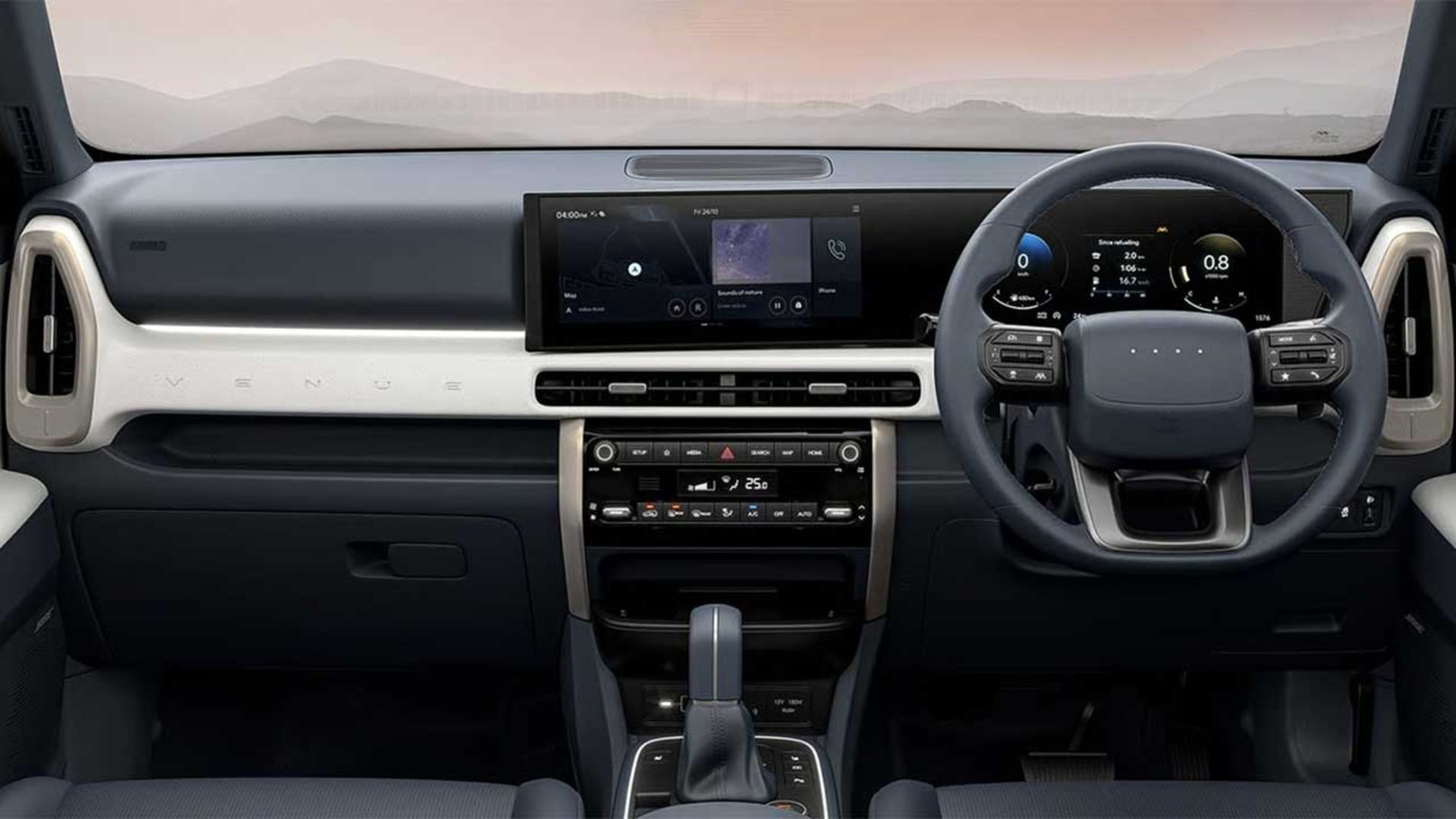 کابین Hyundai Venue کاملاً دگرگون شده و مهمترین ویژگی آن، نمایشگرهای دوگانه ۱۲.۳ اینچی برای صفحه آمپر و اطلاعات-سرگرمی است. فرمان D-cut و نورپردازی داخلی، فضایی جذاب ایجاد کردهاند. افزایش فاصله محوری، فضای پای سرنشینان عقب را نیز بیشتر کرده است.