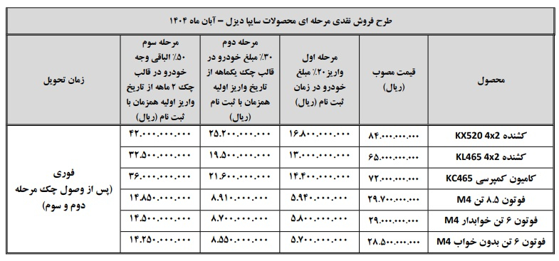 جدول شرایط فروش محصولات سایپا دیزل – آبان 1404