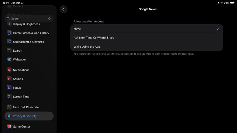 برای این کار، به Settings > Privacy & Security > Location Services بروید. در لیست برنامهها، روی هر برنامه غیرضروری ضربه بزنید و گزینه Never را انتخاب کنید. همچنین در بخش System Services، دسترسی به موقعیت مکانی را برای مواردی مانند iPad Analytics (تحلیلگر آیپد) و Significant Locations & Routes غیرفعال کنید.