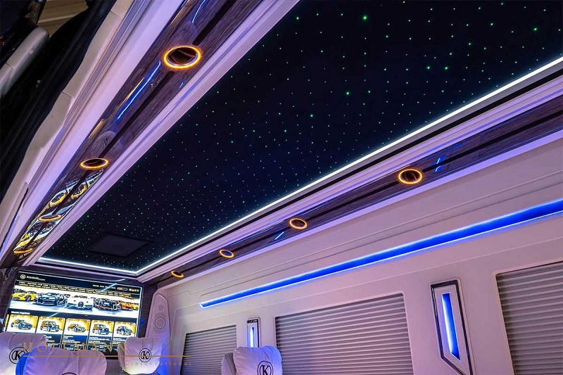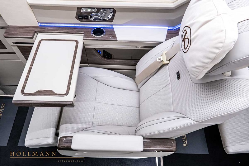 صندلیها از جنس چرم بژ بوده و مجهز به آپشنهایی از قبیل گرم کن، سردکن و ماساژور هستند. دو تلویزیون بزرگ به همراه سیستم نورپردازی هیجان انگیز به نمای لوکس داخل کمک کردهاند. پردههای برقی فضای خصوصی به سرنشینان ارائه میدهد. میزهای تاشو برای قرار دادن وسایل اضافی تعبیه شده و سقف نیز پر از ستارههای پرنور بر جلوه کابین افزودهاند.