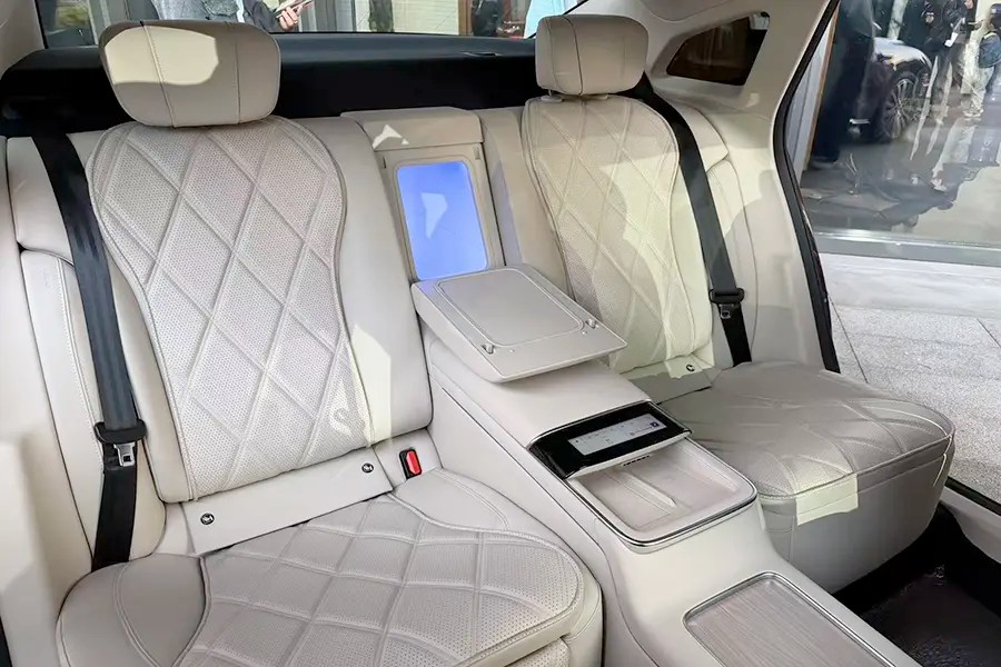 پروفیل جانبی خودرو تمیز و بدون شلوغی است و با جزئیاتی مانند دستگیرههای درب مخفی، به ضریب درگ ۰.۲۳ Cd دست یافته است. این خودرو با ابعاد ۵۰۱۸ میلیمتر طول، ۱۹۶۵ میلیمتر عرض و ۱۵۰۰ میلیمتر ارتفاع، و همچنین فاصله محوری ۳۰۰۰ میلیمتری، فضای داخلی قابل توجهی را ارائه میدهد. طراحی عقب با خوشسلیقگی نمای جلویی را بازتاب میدهد و دارای چراغهای عقب سرتاسری و تریم کرومی روی سپر عقب است.