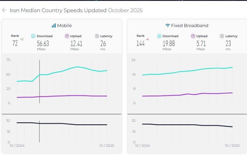 بر اساس آمار منتشر شده در ماه اکتبر ۲۰۲۵، میانه سرعت اینترنت ایران در بخش موبایل به ۵۶.۶۳ مگابیت برثانیه افزایش یافته است. این سرعت، ایران را در ردهبندی جهانی با سه پله صعود به جایگاه ۷۲ رسانده است. ماه پیش از آن، یعنی در سپتامبر ۲۰۲۵، سرعت اینترنت موبایل کشور ۵۵.۳۰ مگابیت برثانیه ثبت شده بود که در آن زمان جایگاه ایران با ۶ پله سقوط مواجه شده بود. در این ردهبندی، ایران بالاتر از کشورهایی مانند گواتمالا (۵۶.۱۴ مگابیت برثانیه) و ازبکستان (۵۵.۵۰ مگابیت برثانیه) و پایینتر از فیلیپین (۵۸.۱۲ مگابیت برثانیه) قرار گرفته است.