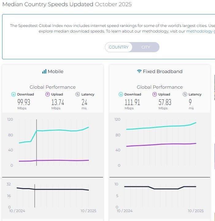 میانه سرعت جهانی اینترنت موبایل در اکتبر ۲۰۲۵ به ۹۹.۹۳ مگابیت برثانیه و اینترنت ثابت به ۱۱۱.۹۱ مگابیت برثانیه رسید. کشورهای پیشرو در سرعت اینترنت موبایل، همچون امارات متحده عربی (۶۵۲.۸۷ مگابیت برثانیه)، قطر (۵۱۵.۲۳ مگابیت برثانیه) و کویت (۳۸۴.۴۰ مگابیت برثانیه) کماکان در صدر جدول قرار دارند و ردهبندی ۹ کشور نخست تغییری نکرده است. در بخش اینترنت ثابت نیز سنگاپور با ۴۰۶.۱۴ مگابیت برثانیه پیشتاز است و تغییر محسوسی در ۸ رده نخست مشاهده نمیشود؛ هرچند تایلند و ویتنام شاهد تغییراتی در جایگاه خود بودند.