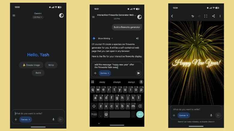 گوگل جمینای امکان ساخت تبریکهای متحرک و خلاقانه برای مناسبتهای مختلف مانند تولد یا اعیاد را فراهم میکند. با استفاده از قابلیت Gemini Canvas که توسط هوش مصنوعی Gemini 2.5 Pro قدرت گرفته، کاربران میتوانند با دستورات متنی ساده، پیامهای تبریک شخصی سازی شده بسازند. پس از ساخت، خروجی را میتوان مشاهده و در صورت نیاز ویرایش کرد و سپس از طریق گزینههای اشتراکگذاری یا کپی لینک، با دوستان و خانواده به اشتراک گذاشت.