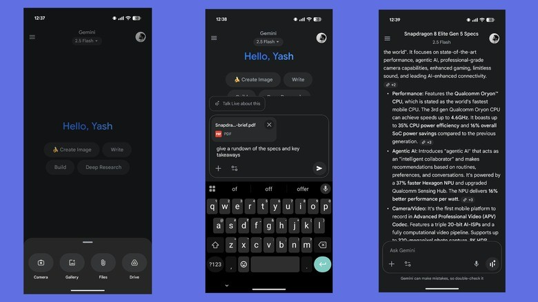 برای استفاده از این ویژگی، کافی است برنامه جمینای را باز کرده، روی دکمه «+» کلیک کنید و فایل خود را از حافظه داخلی یا گوگل درایو بارگذاری کنید. سپس پرسش خود را مطرح کرده تا جمینای به تحلیل و پاسخگویی بپردازد.